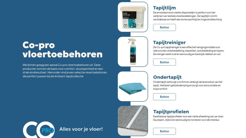 We lichten graag een aantal Co‑pro vloertoebehoren uit. Deze producten vormen de basis voor comfort, duurzaamheid en een strak eindresultaat. Hieronder vind je een selectie vloertoebehoren die perfect passen bij de Ambiant tapijtcollectie.