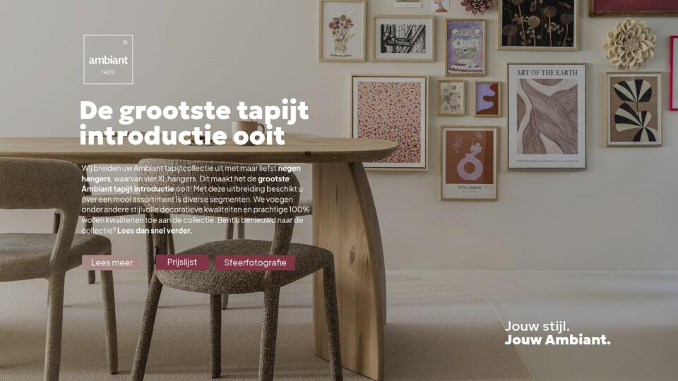 Wij breiden uw Ambiant tapijtcollectie uit met maar liefst negen hangers, waarvan vier XL hangers. Dit maakt het de grootste Ambiant tapijt introductie ooit! Met deze uitbreiding beschikt u over een mooi assortiment is diverse segmenten. We voegen onder andere stijlvolle decoratieve kwaliteiten en prachtige 100% wollen kwaliteiten toe aan de collectie. Bent u benieuwd naar de collectie? Lees dan snel verder.