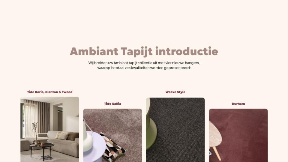 Wij breiden uw Ambiant tapijtcollectie uit met vier nieuwe hangers, waarop in totaal zes kwaliteiten worden gepresenteerd: