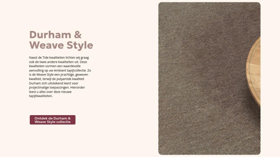 Naast de Tide kwaliteiten lichten wij graag ook de twee andere kwaliteiten uit. Deze kwaliteiten vormen een waardevolle aanvulling op uw Ambiant tapijtcollectie. Zo is de Weave Style een prachtige, geweven kwaliteit, terwijl de polyamide kwaliteit Durham zich uitstekend leent voor projectmatige toepassingen. Hieronder leest u alles over deze nieuwe tapijtkwaliteiten.